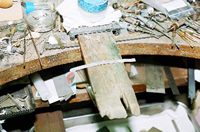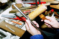2、地金をリング状にし「整形」する リングのサイズ(内径+厚み×3.14)を設定したら、丸める作業に取りかかります。その後、ロウ付け(溶接のようにリングに切り口やパーツ等を付ける作業)を行い、酸洗いを済ませたら、リングの内径のロウをヤスリで削り、歪んでいたリングを“芯金”(写真)に入れ真円に整形します。